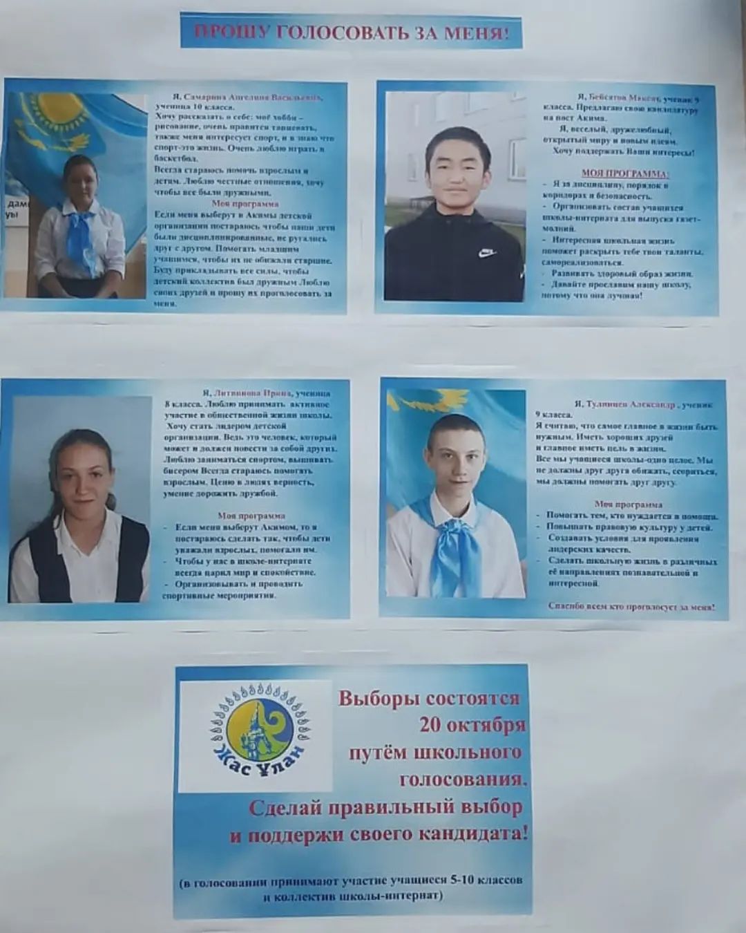 На пост Акима детской организации было зарегистрировано 4 кандидата: Ирина Литвинова – ученица 8 класса, Бейсатов Максат и Тулинцев Александр - учащиеся 9 класса, Самарина Ангелина – ученица 10 класса,